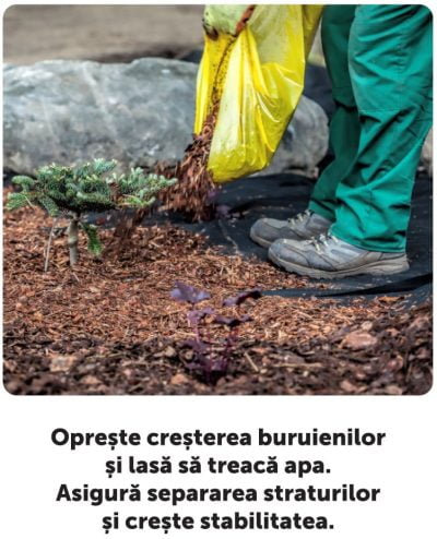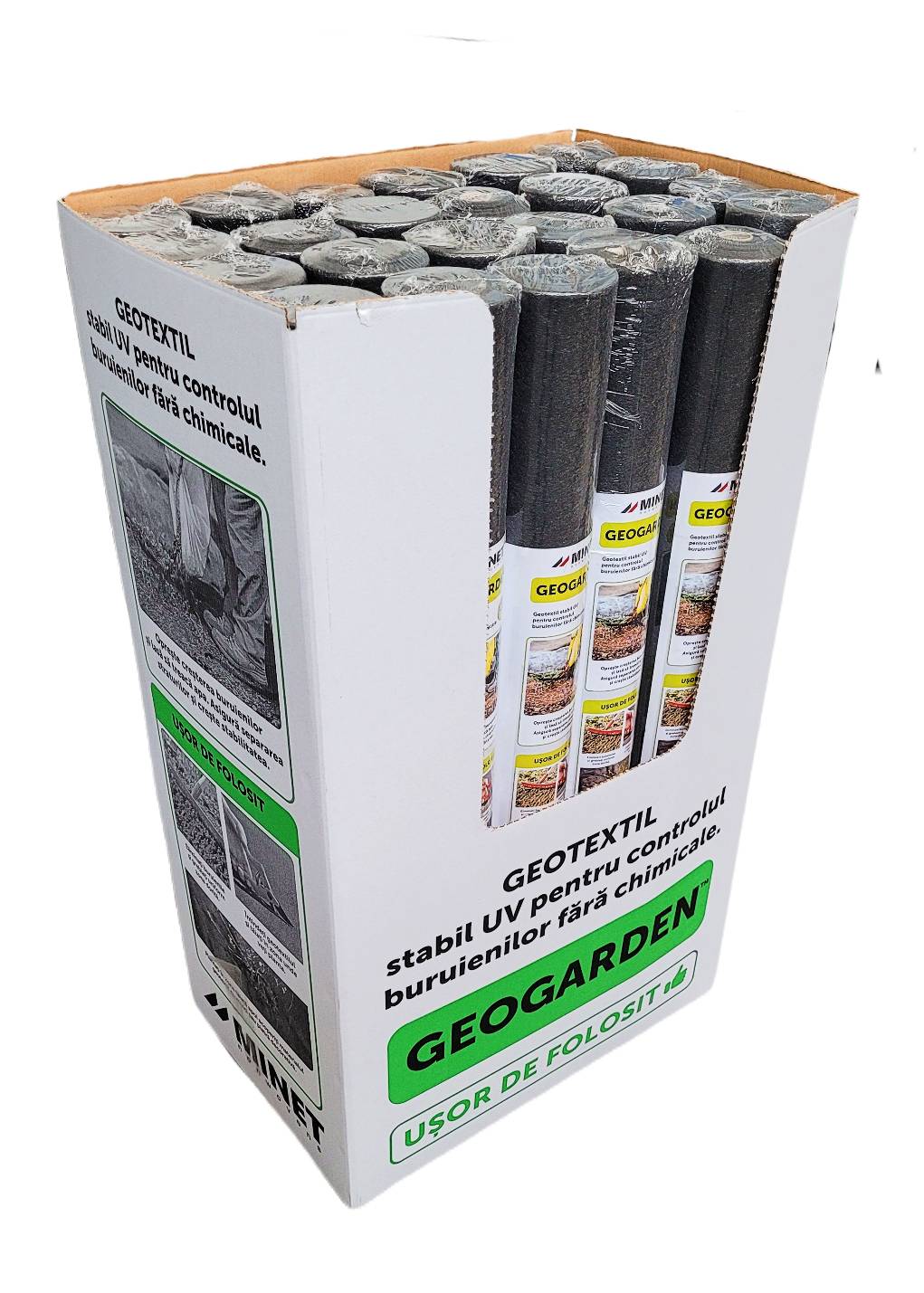 A Geogarden ® geotextil membránfólia 100% polipropilén szálakból készül, sűrűsége 100 gr/m2 , szélessége 1 m , hossza 12 m/tekercs (minden dobozban 24 tekercs van; összesen = 288 m/doboz) .