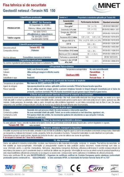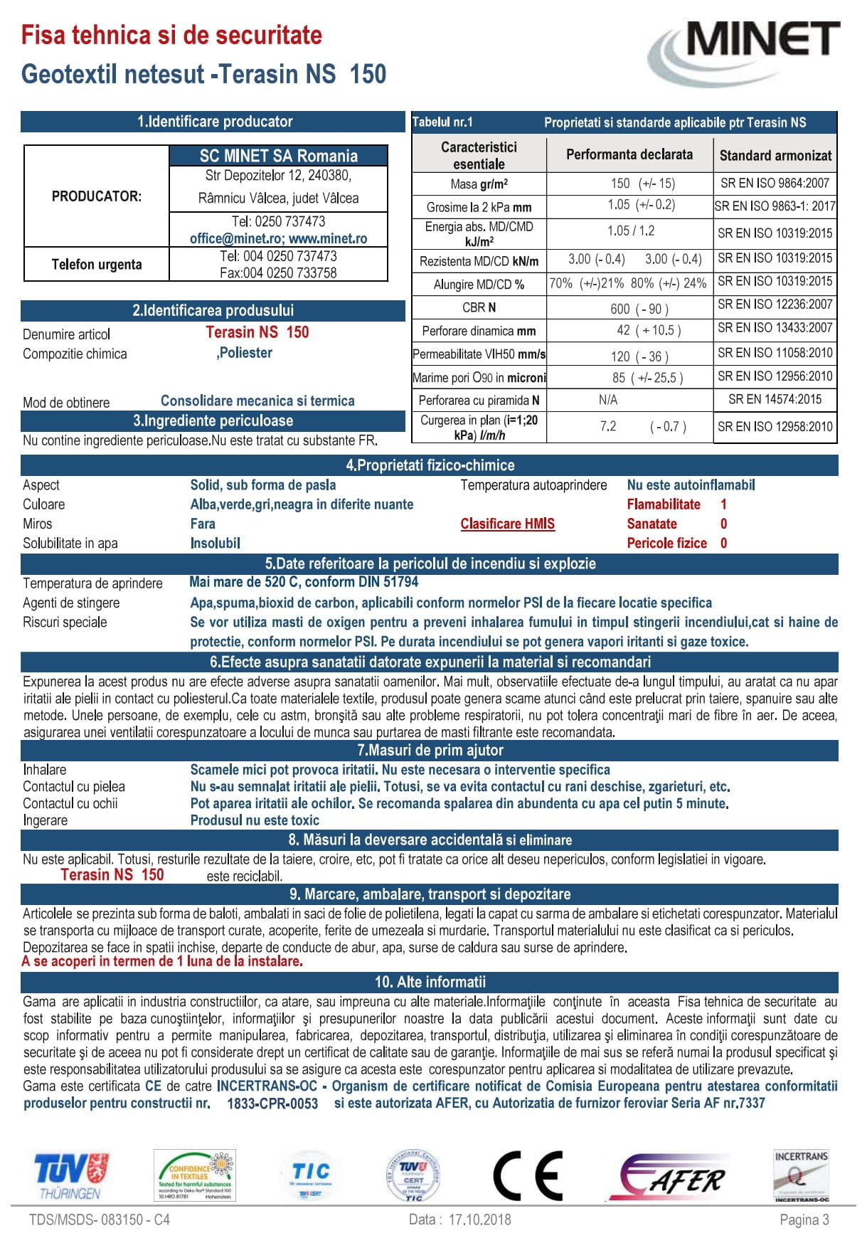 A Minet SA Valcea Teresin N/S nem szőtt geotextíliát poliészter szálak rostos keverékének mechanikai megszilárdításával állítják elő.
